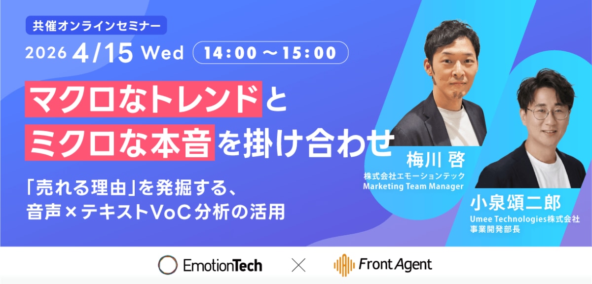 本セミナーでは、膨大なテキストデータから「市場の全体傾向や重要トピック」を生成AIで客観的に抽出する手法と、実際の商談・インタビューの音声データから「発言の裏にある深い心理や感情のニュアンス」を解析する手法を掛け合わせた、次世代の顧客理解フレームワークを公開します。