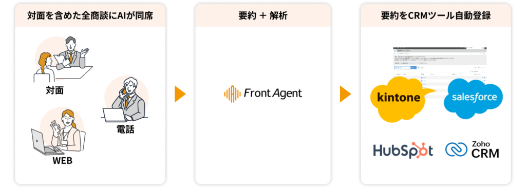 同社は、顧客との商談が膨大に発生する一方で、その記録作成や振り返りの業務に大きな負荷がかかっているという課題を抱えていました。そこで「kintone」と連携が可能なFront Agentを導入したところ、Front Agentが自動で議事録を作成し、その内容がkintoneに自動登録されるようになったことで業務効率化を実現。担当者の作業負担や情報共有にかかるコストが大幅に軽減されただけでなく、客観的な分析データをもとに商談戦略の最適化や社員教育へ活用できるようになるなど、業務全体の質向上にもつながりました。