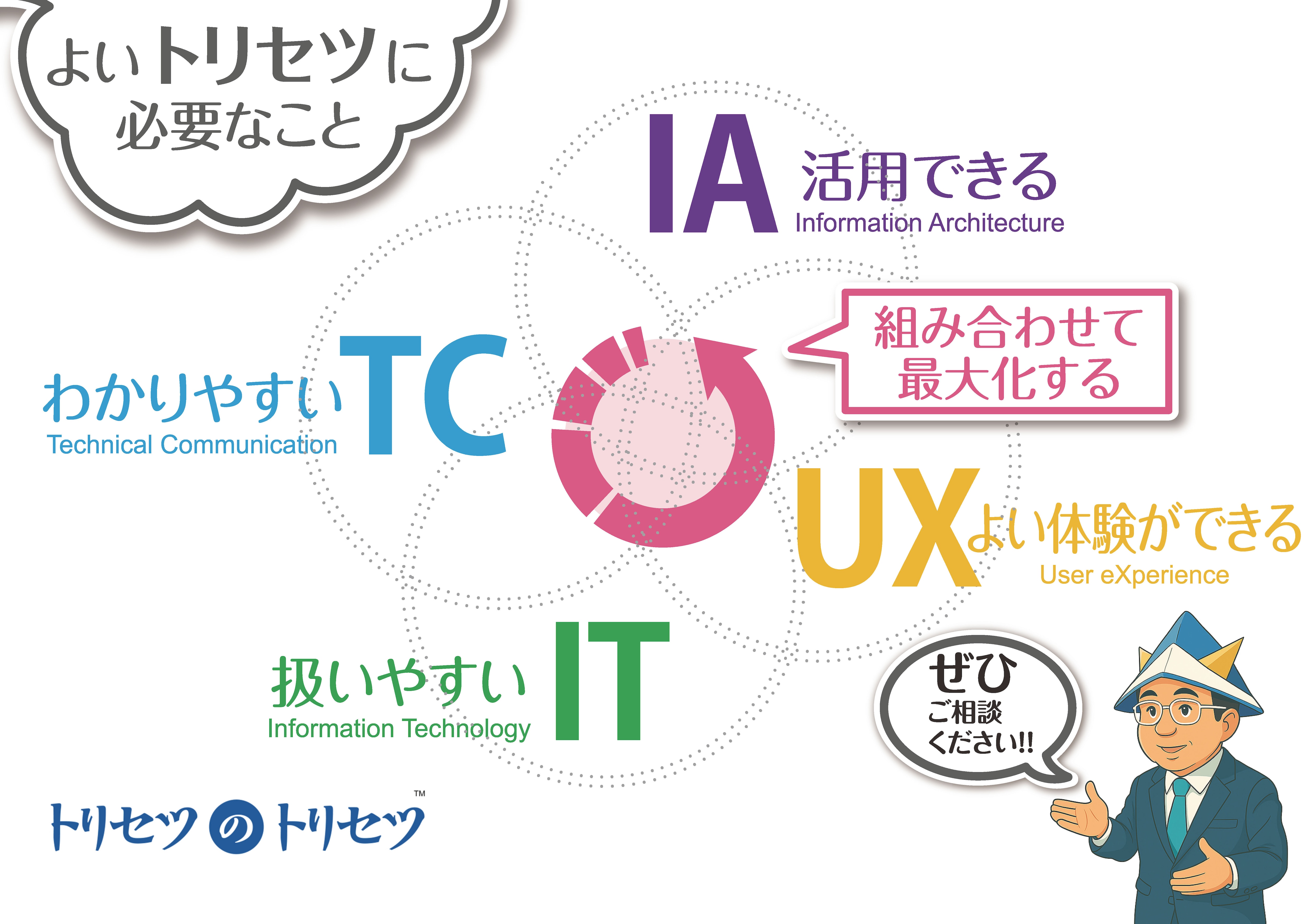 「概念設計」「体験設計」「情報の構造化」「テクニカルライティング」という情報設計の基盤となる要素を、内容や状況に応じて組み合わせています。また、中には取扱説明書でご相談をいただいても、最適な手段が取扱説明書ではない場合もあり、取扱説明書以外のコンテンツをおすすめする場合もあります。