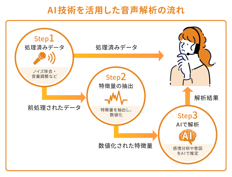AIを活用した音声解析は、以下の3つのステップで実施されます。