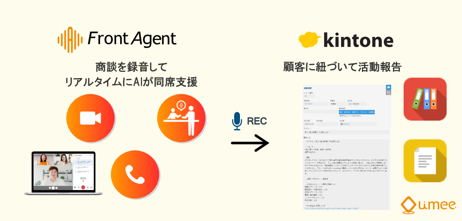 kintoneの外部連携サービスの中で、録音した会話データをAIが自動で議事録化し、それを自動連携できるサービスとして知られているのが、当社が提供している「Front Agent」です。