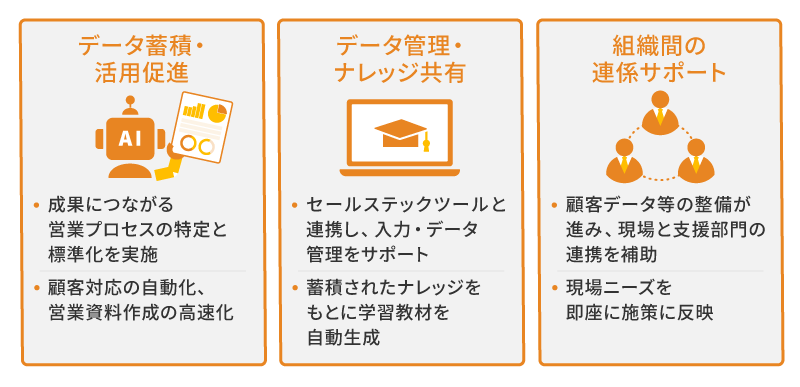 セールスイネーブルメントにAIを活用することで、「営業データの蓄積・活用の促進」「データ管理・ナレッジ共有の効率化」「現場と支援部門といった組織間の連携強化」という効果が期待できます。セールスイネーブルメントの推進を妨げる課題を解消し、組織全体の営業力を、より効率的に底上げすることが可能になります。