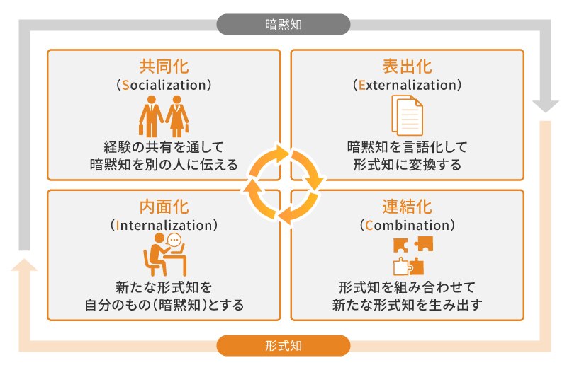 SECIモデルは、暗黙知を形式知へ変換し、さらに形式知から新たな暗黙知を生み出すという、継続的な知識創造のサイクルを4つのプロセスで説明しています。