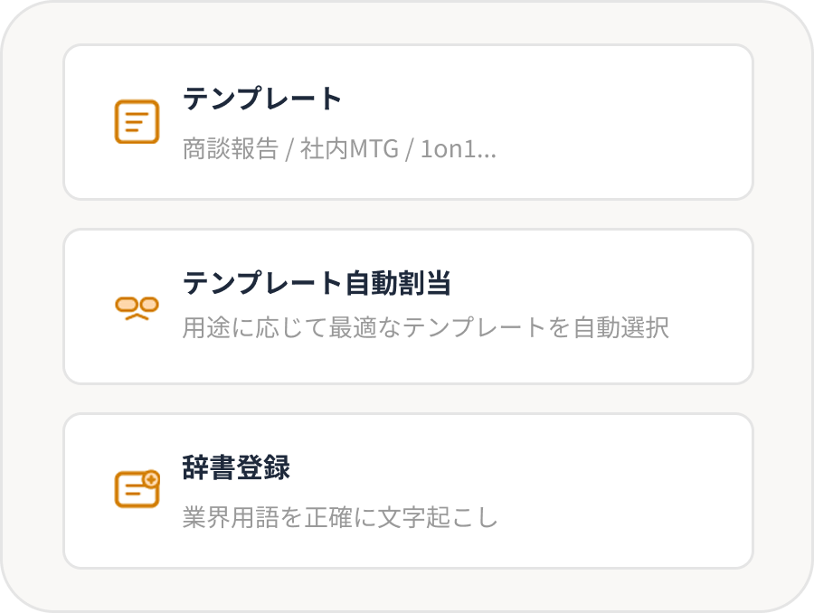 テンプレートのカスタマイズ、用途に応じた自動割当、専門用語の辞書登録——他の議事録AIでは手が届かないポイントまでカバーし、組織に最適化された運用を実現します。