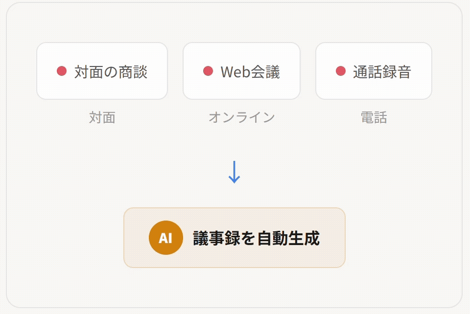 対面・携帯電話・固定電話・Web会議——すべてのチャネルに対応。録音ボタンを押すだけで、AIが話者を分離し、正確な議事録を自動生成します。