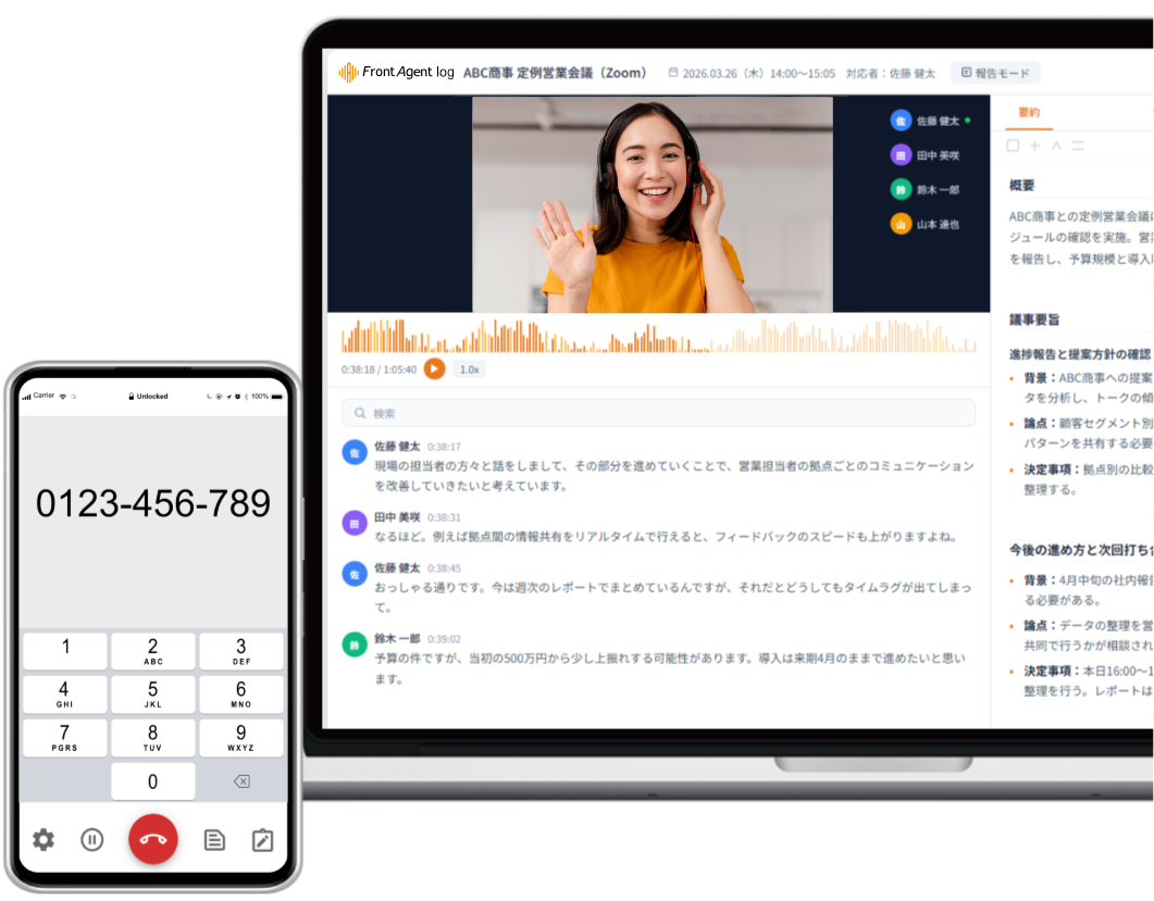 Front Agent Logは単体でもご利用いただけます。ただし、Front Agent®と連携することで議事録データを解析基盤に接続でき、より大きな価値を発揮します。