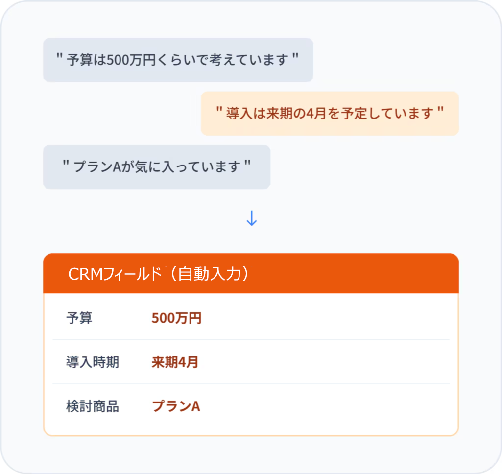 予算・検討商品・導入時期・競合情報——会話の中に散らばるヒアリング項目をAIが検出し、CRM/SFAの対応フィールドへ自動入力。入力工数を劇的に削減します。