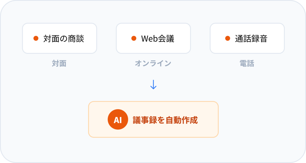 対面・携帯電話・固定電話・Web会議——すべてのチャネルに対応。録音ボタンを押すだけで、AIが話者を分離し、正確な議事録を自動生成します。