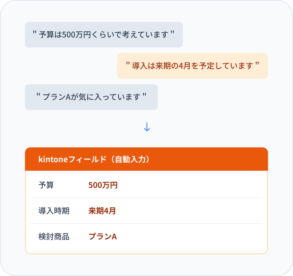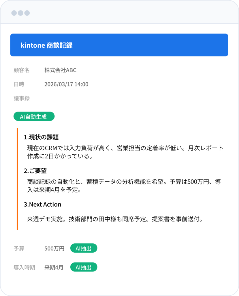 予算・検討商品・導入時期・競合情報——会話の中に散らばるヒアリング項目をAIが検出し、キントーンの対応フィールドへ自動入力。入力工数を劇的に削減します。