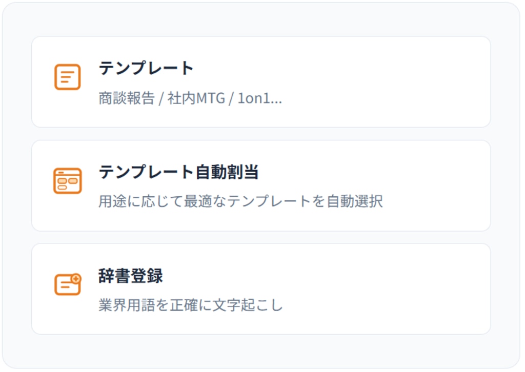 テンプレートのカスタマイズ、用途に応じた自動割り当て、専門用語の辞書登録——他の議事録AIでは手が届かないポイントまでカバーし、組織に最適化された運用を実現します。